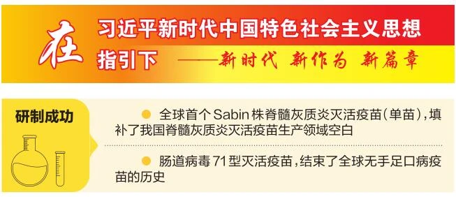 “十三五”期間,醫科院生物所疫苗研發取得重大突破。研制成功全球首個Sabin株脊髓灰質炎滅活疫苗(單苗),該疫苗于2015年1月14日獲批上市,填補了我國脊髓灰質炎滅活疫苗生產領域的空白,實現了我國疫苗從“中國制造”向“中國創造”的邁進,打破了發達國家對脊髓灰質炎滅活疫苗生產技術的壟斷。2016年5月1日起實施的脊髓灰質炎疫苗免疫策略,該疫苗被納入國家兒童免疫規劃。2015年12月3日,醫科院生物所研發的腸道病毒71型滅活疫苗(人二倍體細胞)獲批上市,成為全球首個預防腸道病毒71型病毒感染引起手足口病的疫苗。該疫苗保護機理清楚,保護時間長,可交叉保護9種基因亞型EV71病毒。腸道病毒71型滅活疫苗的成功研制及產業化,結束了全球無手足口病疫苗的歷史。該疫苗上市后,2018年我國手足口病死亡病例較2016年下降82%,重癥病例較2016年下降68%。同時,醫科院生物所研發的I型、III型脊髓灰質炎減毒活疫苗(人二倍體細胞)系列產品于2018年11月通過國家GMP檢查并投產上市,對我國脊髓灰質炎系列疫苗起到了補充和完善作用。