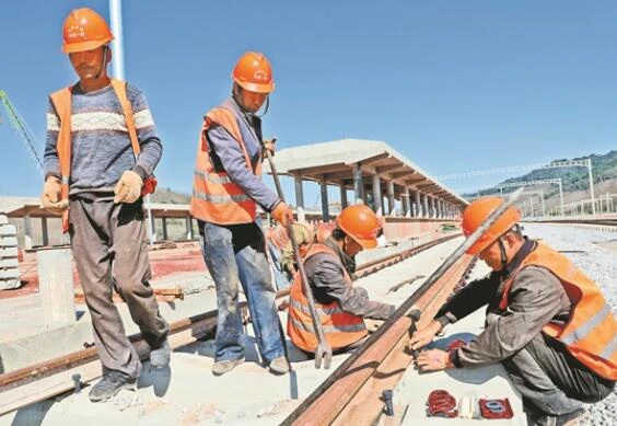 隧道外的磨憨火車站,一部帶有6節風動卸砟車的綠皮內燃機車,和用于整形、搗固、穩定的3臺黃色大型機車正有條不紊地進行著軌道鋪架工作。項目副總工李信剛介紹,預計今年7月底可以全線鋪通,年底前實現通車。由于鋪軌任務比較重,工期壓力大,項目部的1400余名工人和管理人員就在工地過春節了。