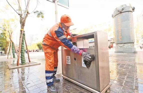 新春佳節(jié)期間,環(huán)衛(wèi)工人在昆明南屏街上清潔路面的垃圾箱 記者 陳飛 攝
