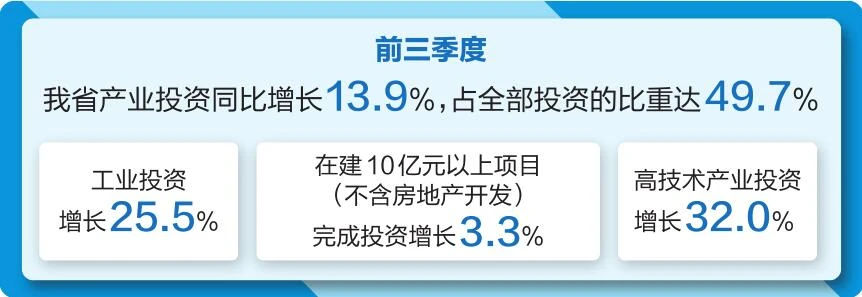 前三季度,我省產(chǎn)業(yè)投資同比增長(zhǎng)13.9%,占全部投資的比重達(dá)49.7%,創(chuàng)歷史新高,拉動(dòng)全部投資增長(zhǎng)5.5個(gè)百分點(diǎn),成為拉動(dòng)全省投資增長(zhǎng)、推動(dòng)投資結(jié)構(gòu)優(yōu)化的主引擎。其中,工業(yè)投資增長(zhǎng)25.5%,占全部投資的比重為27.6%,持續(xù)保持高增長(zhǎng)態(tài)勢(shì)。