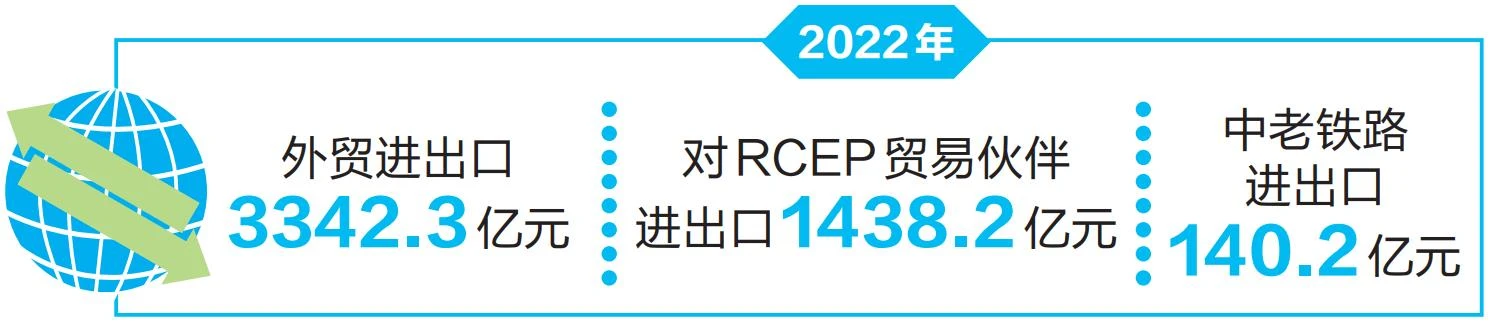 2022年,我省對(duì)RCEP貿(mào)易伙伴進(jìn)出口1438.2億元,增長2.1%。對(duì)東盟進(jìn)出口1273.7億元,增長2.3%,其中,與緬甸、泰國、馬來西亞、老撾進(jìn)出口值分別增長6%、21.7%、73.2%和38.5%。2022年,中老鐵路進(jìn)出口140.2億元,其中出口99.4億元,進(jìn)口40.8億元。其中,我省企業(yè)經(jīng)中老鐵路進(jìn)出口58.7億元。