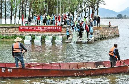 3月22日是第三十一屆“世界水日”,在昆明大觀公園樓外樓滇池草海航道水域,50名科技志愿者將8000尾滇池土著魚金線鲃魚苗進行科學放流。