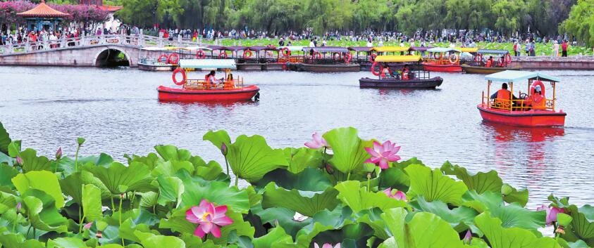 圖為游客在昆明市大觀公園避暑賞荷。(記者 楊崢 攝)