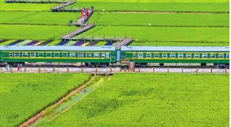 圖為觀光小火車行駛在晉寧區晉城街道沙堤村藝術稻田間。(通訊員 宋光旭 攝)