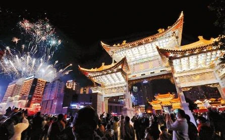 除夕夜,昆明市區上演新春煙花秀。圖為市民在金碧廣場觀看絢爛煙花。云南日報記者 黃興能 攝