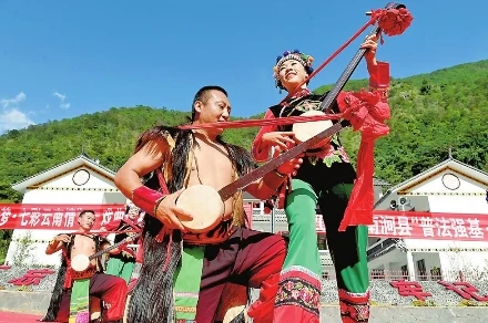 日前,南澗彝族自治縣跳菜藝術(shù)團(tuán)開展戲曲進(jìn)鄉(xiāng)村文化惠民活動(dòng),豐富農(nóng)村群眾文化生活。 圖為藝術(shù)團(tuán)演員在公郎鎮(zhèn)板橋村表演彝族大三弦。通訊員 適志宏 攝