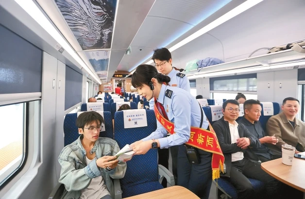 工作人員在列車上開展宣傳。