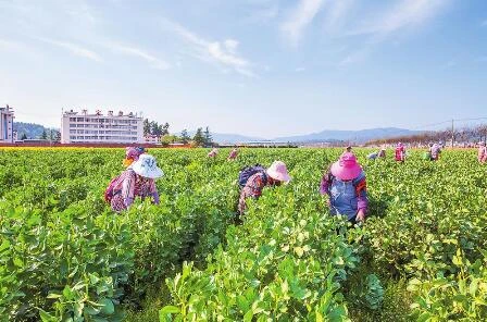 近年來,牟定縣推動蠶豆產業加快發展,鮮蠶豆暢銷上海市場,2023年銷售額接近9000萬元,帶動當地農民增收致富。牟定蠶豆早熟且銷售期短,經分揀包裝后運至上海,大約需要48小時。上海市江橋批發市場設立綠色通道和專門倉位,確保蠶豆運抵上海市場時保持鮮度和品質。圖為群眾在采摘蠶豆。(見習記者 段曉宇 通訊員 張芹洪 畢瓊 攝)