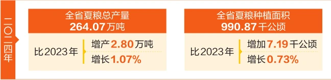 播種面積穩步增長。全省夏糧種植面積990.87千公頃(1486.30萬畝),比2023年增加7.19千公頃(10.78萬畝),增長0.73%。其中,谷物播種面積515.69千公頃(773.54萬畝),比2023年減0.17%。豆類播種面積310.01千公頃(465.01萬畝),比2023年增長1.85%。薯類播種面積165.17千公頃(247.75萬畝),比2023年增長1.52%。