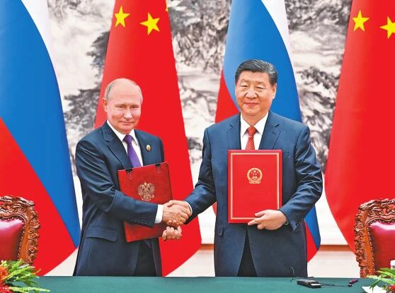 5月16日上午,國家主席習近平在北京人民大會堂同來華進行國事訪問的俄羅斯總統普京舉行會談。這是會談后,兩國元首共同簽署并發表《中華人民共和國和俄羅斯聯邦在兩國建交75周年之際關于深化新時代全面戰略協作伙伴關系的聯合聲明》。新華社記者 饒愛民 攝