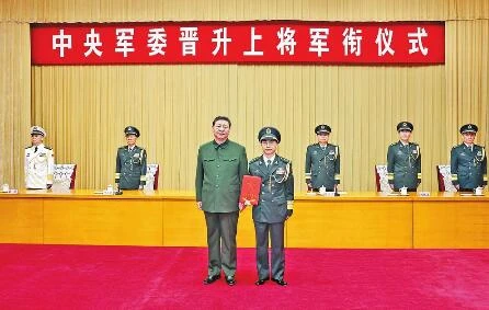 下午4時(shí)許,晉銜儀式在莊嚴(yán)的中華人民共和國國歌聲中開始。中央軍委副主席張又俠宣讀了中央軍委主席習(xí)近平簽署的晉升上將軍銜命令。中央軍委副主席何衛(wèi)東主持晉銜儀式。