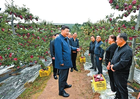 紅彤彤的花牛蘋果掛滿枝頭,一派豐收景象。習近平走進果林,了解相關種植、技術和管理情況。他說,鄉村振興關鍵在產業振興。經過70多年培育發展,花牛蘋果品牌更響亮了。要加強品種保護和培育,優化種植方式,創新營銷模式,把這個特色產業做得更大,帶動更多群眾增收致富。他祝鄉親們的生活像蘋果一樣紅紅火火。