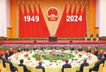 人民大會堂宴會廳華燈璀璨,洋溢著喜慶熱烈的節(jié)日氛圍。主席臺上方高懸著莊嚴的國徽,“1949—2024”大字年號在鮮艷紅旗映襯下格外醒目。