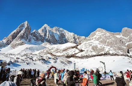 幾場大范圍降雪后,麗江玉龍雪山景區迎來冰雪旅游熱潮。春節假日,在海拔4506米到4680米的冰川公園,每天有近萬名游客爬棧道、賞雪景、看云海,盡情享受冰雪世界帶來的歡樂。(記者 李鐵成 攝)