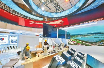在中核集團展區,施工人員正緊張有序布展。 記者 高吳雙 攝