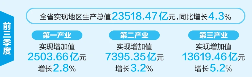 10月23日,云南省統計局、國家統計局云南調查總隊發布數據顯示: 根據地區生產總值統一核算結果,前三季度全省實現地區生產總值23518.47億元,按不變價格計算,同比增長4.3%。分三次產業看,第一產業實現增加值2503.66億元,增長2.8%;第二產業實現增加值7395.35億元,增長3.2%;第三產業實現增加值13619.46億元,增長5.2%。