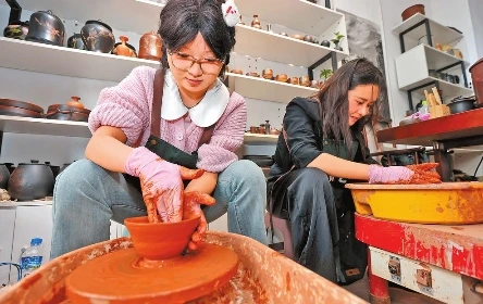 在建水古城的紫陶店里,游客可體驗國家級非物質文化遺產建水紫陶的拉坯制作過程,可在匠人指導下沉浸式體驗輪盤旋轉間一團泥變成各種器具的細膩感受。