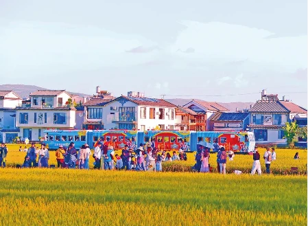 金秋十月,大理喜洲稻浪翻涌,“喜洲號”“有風號”小火車滿載游客在稻田間穿行,形成獨特的風景線,吸引了眾多游客。近年來,喜洲鎮通過“稻田+鐵路”場景再造,將田園景觀轉化為可沉浸式體驗的移動劇場,帶動周邊稻田咖啡、稻田旅拍等業態蓬勃發展,這片蒼山腳下的稻田成為大理文旅的熱門IP。(記者 黃興能 攝)