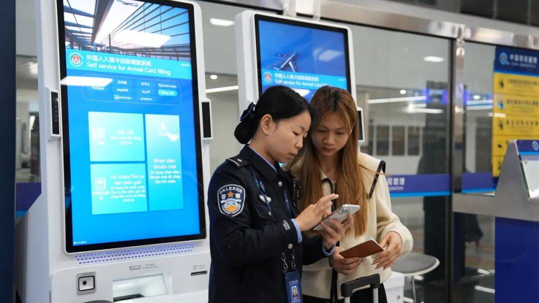 河口邊檢站民警指引通關旅客使用外國人入境卡網上填報系統。(彭正 攝)