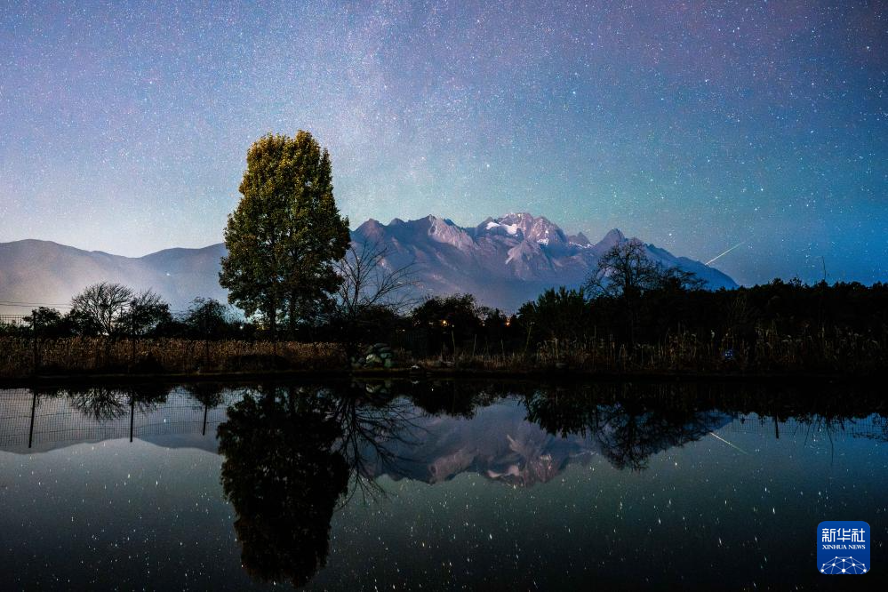 12月14日凌晨在云南省麗江市玉龍雪山腳下拍攝的雙子座流星雨。新華社記者 胡超 攝