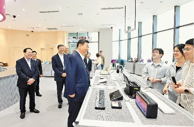 4月29日,中共中央總書記、國家主席、中央軍委主席習近平在上海考察。這是習近平在位于徐匯區的上海“模速空間”大模型創新生態社區人工智能產品體驗店考察。新華社記者 謝環馳 攝
