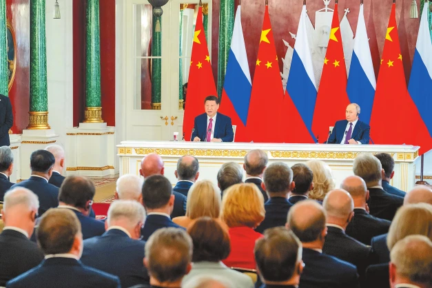 習近平強調,面對變亂交織的國際形勢,中俄兩國要堅定秉持永久睦鄰友好、全面戰略協作、互利合作共贏精神,風雨同渡、關山共越,全面提升中俄關系的高度、維度、韌度,為世界和平和安全注入更多穩定性,為全球發展繁榮提供更強推動力。