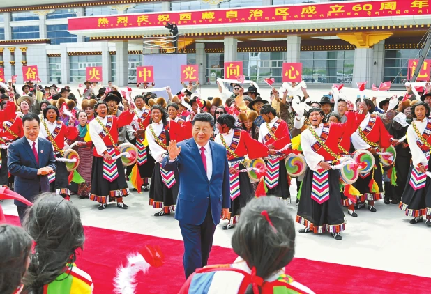 習近平離開西藏時,各族群眾紛紛來到拉薩市區的沿途道路兩旁,揮舞紅旗、手捧哈達,歡呼著向總書記問好,向總書記表達由衷的愛戴。拉薩貢嘎機場,身著節日盛裝的干部群眾揮舞著紅旗和花束,載歌載舞,高喊“扎西德勒”,表達高原兒女對以習近平同志為核心的黨中央的感激之情、對建設社會主義現代化新西藏的堅定信心。